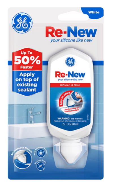 - RE-NEW Damaged caulk in your kitchen area or bathroom can unfortunately have long-lasting impacts. Instead, try the right kind of long-lasting results that come with the quick and simple use of GE RE-NEW Sealant in no time at all! Renew and refresh your space by cleaning the existing caulk with a damp cloth (or use mold cleaning, if necessary), then apply RE-NEW on top of it with a gentle squeeze. This smoothing tool is flexible, waterproof, and leaves a professional, perfect finish, every time. 2.7oz
